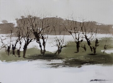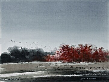 ??????? 不同的風景事實上也就意味著不同的認同,意味著分離和旁觀,也意味著表現(xiàn)和敘述,折射著對于歷史的不同訴求。那么,面對現(xiàn)代文明對傳統(tǒng)文化的無情吞噬的現(xiàn)實情境,藝術(shù)家周利群筆下的風景就是對這種現(xiàn)實情境的一種不認同。因為,所有的風景背后都是人,任何景觀的含義都是人賦予的。正如溫迪·J·達比所言:其中必然涉及到誰有權(quán)控制、利用、表征、再現(xiàn)、改造這些風景。我們所到的任何一處風景,它所展示給我們的含義,都來自于背后這個交織在一起的話語——對此的反思之所以如此重要,是因為我們?nèi)魏稳松钤谄渲械目臻g都是雙重的:它既是一個地理空間,又是一個意義系統(tǒng)編織起來的空間。哪怕是無人的風景……(【美】溫迪·J·達比:風景的認同,譯林出版社,2011。)通覽這個展覽,我們或許能從這些“無人的風景畫”感受到藝術(shù)家周利群的感覺與敘述——對離原對山鄉(xiāng)的反復游觀與體驗,無疑使他具備了以上論述的那種歷史歸屬感以及經(jīng)驗性的集體記憶。
