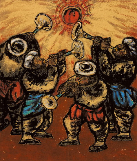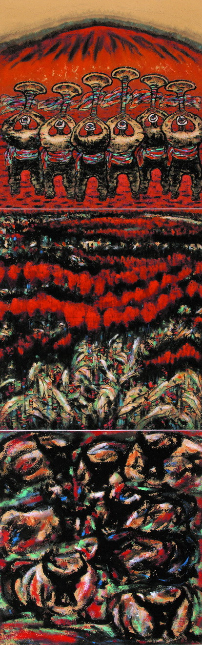 ??? 每當(dāng)我踏上峰戀疊嶂、溪河縱橫的鄂西山區(qū),常常被粗獷而質(zhì)樸、古老而神秘的氛圍所籠罩,亦為世代生息于斯的土家族山民的生活及巴楚文化所吸引。我愛(ài)土家山民吹著那古樸的銅喇叭,它在土家人的嘴上吹奏出令人醉心的痛苦和歡樂(lè),也愛(ài)土家男女老少如醉如癡地跳著那優(yōu)美的巴山舞,還有那恬靜的山野、清香的苞谷地,山一樣的牛、云一般的羊、清而純的清江水……這種質(zhì)樸的生活、質(zhì)樸的情、質(zhì)樸的美格外吸引我、打動(dòng)我。我愛(ài)山里人的誠(chéng)摯樸素,喜歡與山民交朋友。從八十年代起我便以地處鄂西山區(qū)的長(zhǎng)陽(yáng)土家為創(chuàng)作生活的基地,每年都習(xí)慣要去那里寫(xiě)生或看看山村的變化。堅(jiān)實(shí)神秘的紅土,凝聚著世間的無(wú)窮生命、無(wú)限力量。土家人對(duì)于生命、對(duì)生與死有著自已獨(dú)特的思索和表達(dá)方式。以哭嫁和跳喪為例,哭嫁是女子婚嫁的一種告別儀式,哭嫁歌是一種長(zhǎng)詩(shī)結(jié)構(gòu)和抒情悲歌,是樂(lè)極之悲,以歌當(dāng)哭,盡情宣泄。跳喪是老人謝世后,哀家舉行的一種吊喪儀式,人們?cè)谝环N悲壯的氣氛中擊鼓而歌,踏地而舞,通宵達(dá)旦,近于迷狂??藜夼c跳喪是對(duì)人生悲歡激情的大宣泄,是對(duì)生與死得一種精神上的解脫。我在《紅土系列》創(chuàng)作“跳喪”的畫(huà)中,將擊鼓和跳舞者以古樸、簡(jiǎn)潔、渾厚的整體造型以及富于裝飾、充滿張力的構(gòu)圖,在黃色粗質(zhì)的土紙上以紅黃黑三色為基調(diào),紅黑交輝、藍(lán)綠相映,原始的意味、跳躍的激情,使畫(huà)面呈現(xiàn)強(qiáng)烈而深沉、浪漫而神秘的氣氛。