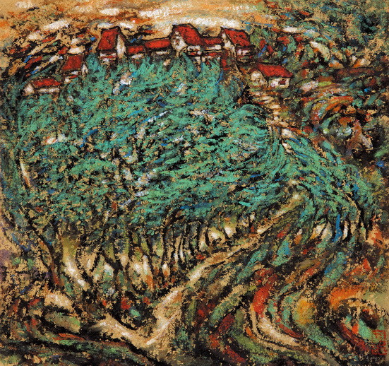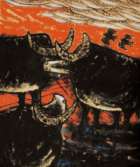 ??? 運(yùn)用手工土紙作畫(huà),是在長(zhǎng)陽(yáng)山區(qū)寫(xiě)生時(shí),就地取材買(mǎi)下土紙?jiān)囉?,不意產(chǎn)生獨(dú)特的效果,后來(lái)我在當(dāng)?shù)貙iT(mén)加工定制這種手工土紙作畫(huà)。由于土紙和宣紙的性能完全不同,土紙的質(zhì)地粗松、浸水性能較差,既不宜發(fā)揮水墨的細(xì)膩效果,也不宜表現(xiàn)筆觸的豐富姿態(tài),但它適宜表現(xiàn)那粗渾枯澀的紅土質(zhì)地和山民那粗獷質(zhì)樸的性格,它還適宜追求墨、色、線、塊的寫(xiě)意重彩效果,可反復(fù)多層次的涂寫(xiě),把握渾厚的造型、整體的氛圍和強(qiáng)烈的色彩,使畫(huà)面顯得古樸、厚重。這了適應(yīng)這種土紙的特性,我吸取楚漆、漢畫(huà)和古代壁畫(huà)等我國(guó)古代和民間的藝術(shù)特點(diǎn),同時(shí)借鑒西方藝術(shù)經(jīng)驗(yàn),努力尋求、探索自已的藝術(shù)語(yǔ)言。