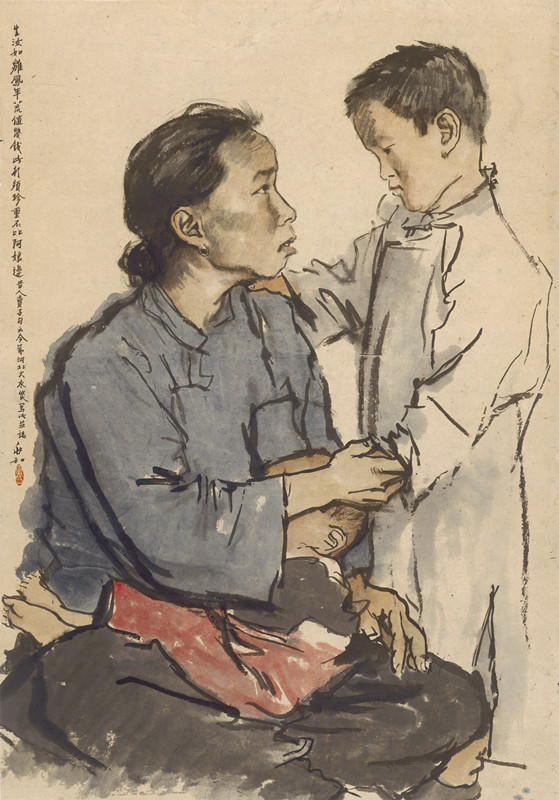 他的作品《賣子圖》反映了1939年日軍制造的河北大水災(zāi)中民眾的凄苦生活,畫面描繪了一個(gè)母親握著即將失去的兒子的手,旁提昔人買子句:“生汝如雛鳳,年荒值幾錢,此行須珍重,不比阿娘邊。”這樣的畫我們連眼淚都看出來了。一個(gè)藝術(shù)家對(duì)生活的感悟,只用寥寥數(shù)筆便能兼具神形。在感悟生活的層面,蔣兆和通過一個(gè)小人物展現(xiàn)出時(shí)代的大背景,折射出一種社會(huì)的真實(shí)狀態(tài)和人民的生活面貌。他的人物畫涵蓋了各個(gè)社會(huì)層面,還涉及了各個(gè)歷史時(shí)期的題材和人物,可謂“寫盡蒼生”。每一個(gè)作品都體現(xiàn)出了他對(duì)人物的認(rèn)識(shí)以及體會(huì),并通過他高超的人物畫寫實(shí)手法記錄下來。而其代表作《流民圖》以水墨技法的綜合運(yùn)用和特寫式深入刻畫,使人物形象具有了文學(xué)化的典型意味和史詩般的悲劇氣質(zhì)。