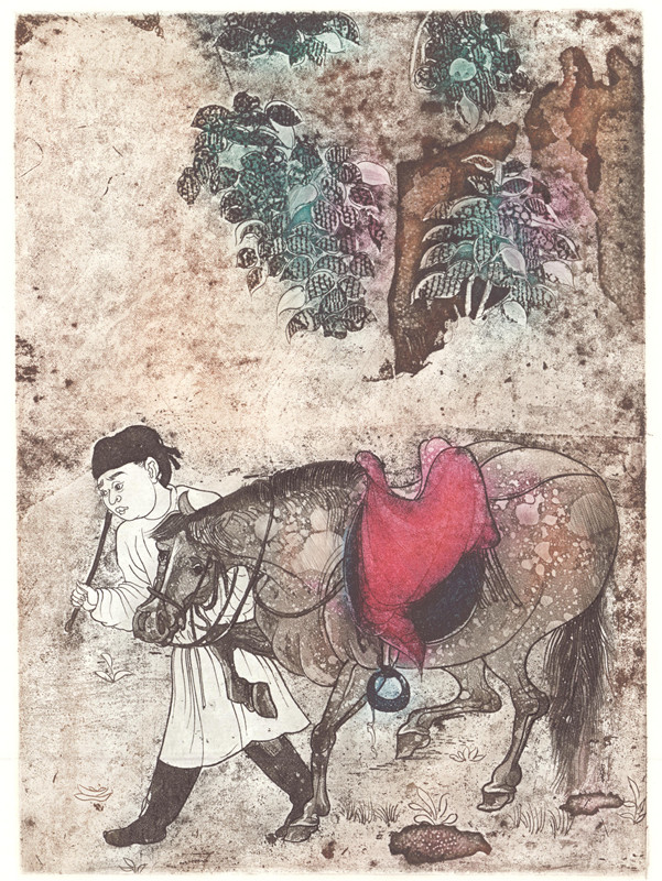 非常值得重視的是魏謙的藝術(shù)創(chuàng)作一直沒有離開“生活是唯一的創(chuàng)作源泉”,并且牢牢抓住了這一底線。在新疆地區(qū)的生活經(jīng)歷為藝術(shù)家的創(chuàng)作道路打下堅(jiān)實(shí)的基礎(chǔ),也奠定了其作品鮮明的民族情懷和和文化尋根的藝術(shù)基調(diào)。從對(duì)西部風(fēng)情寫實(shí)主義的再現(xiàn),到對(duì)傳統(tǒng)西域文化和現(xiàn)代時(shí)空觀念的理性重構(gòu),再到回歸對(duì)文化源頭與生命本體的思考,都離不開魏謙對(duì)新疆地區(qū)風(fēng)土人情、山川河流和文化內(nèi)涵的認(rèn)同感,也體現(xiàn)著藝術(shù)家對(duì)地理空間坐標(biāo)和文化空間坐標(biāo)的雙重追溯。兩者伴隨著魏謙的創(chuàng)作從形式語言、精神內(nèi)涵到技巧手法的突破與創(chuàng)新,并逐步構(gòu)建出了一種獨(dú)特的銅版畫語言體系。銅版畫作為西方的媒介在東方的土壤中生出新意,不類于晦澀艱深的“觀念藝術(shù)”及單純追求特技效果的新潮版畫,魏謙的銅版畫以其理性哲思的內(nèi)斂博大成為中國現(xiàn)當(dāng)代銅版畫的一個(gè)藝術(shù)切片。