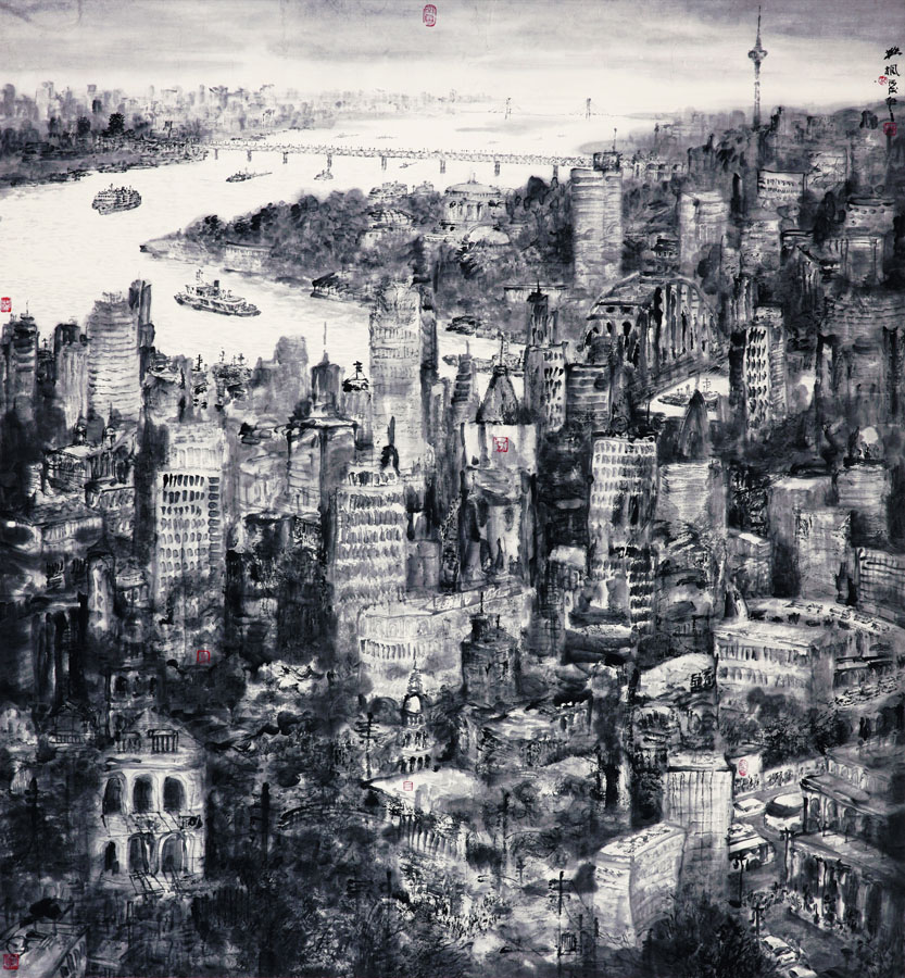 樊楓的視覺圖像世界撲面而來的是一種對都市化進程中社會結(jié)構轉(zhuǎn)型所帶來的思想方式和生活方式變化的講述,對于樊楓這個生于武漢長于武漢的人而言,如果沒有對武漢這個城市刻骨銘心的體驗是不可能營構出彌漫著強烈的老武漢歲月的印跡及其令人頗為向往的老武漢那難尋的容顏。他的視覺圖像世界不僅詔示出武漢人共有的歷史記憶,更以一種的武漢之神韻的才情把武漢所曾經(jīng)歷的苦難、憂傷、憧憬、希望及變幻的時空透過其水墨的宣泄,給閱讀者帶來一個由開埠、繁盛、衰落、復興的武漢。在樊楓的筆意與墨韻間,不僅凝聚著他對武漢的一往情深,更以一種深刻的思想,隱隱的傷痛感染著每一位走近其圖像世界人的心靈。它不僅令人激情飛揚,更對武漢城市未來的社會圖景充斥著無盡而又浪漫的激情想象。