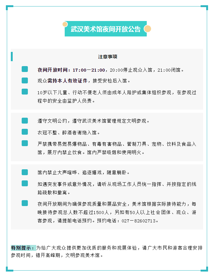 根據(jù)我市關(guān)于公共文化夜間試點(diǎn)開(kāi)放工作的批示精神,武漢美術(shù)館作為公共文化場(chǎng)館先期試點(diǎn)單位,將免費(fèi)向公眾夜間開(kāi)放,時(shí)間為2019年8月17日—10月31日,每逢周六、周日以及重要節(jié)點(diǎn)、法定節(jié)假日,延長(zhǎng)開(kāi)放時(shí)間。為保證文明有序的參觀秩序,現(xiàn)就有關(guān)觀展注意事項(xiàng)公告如下: