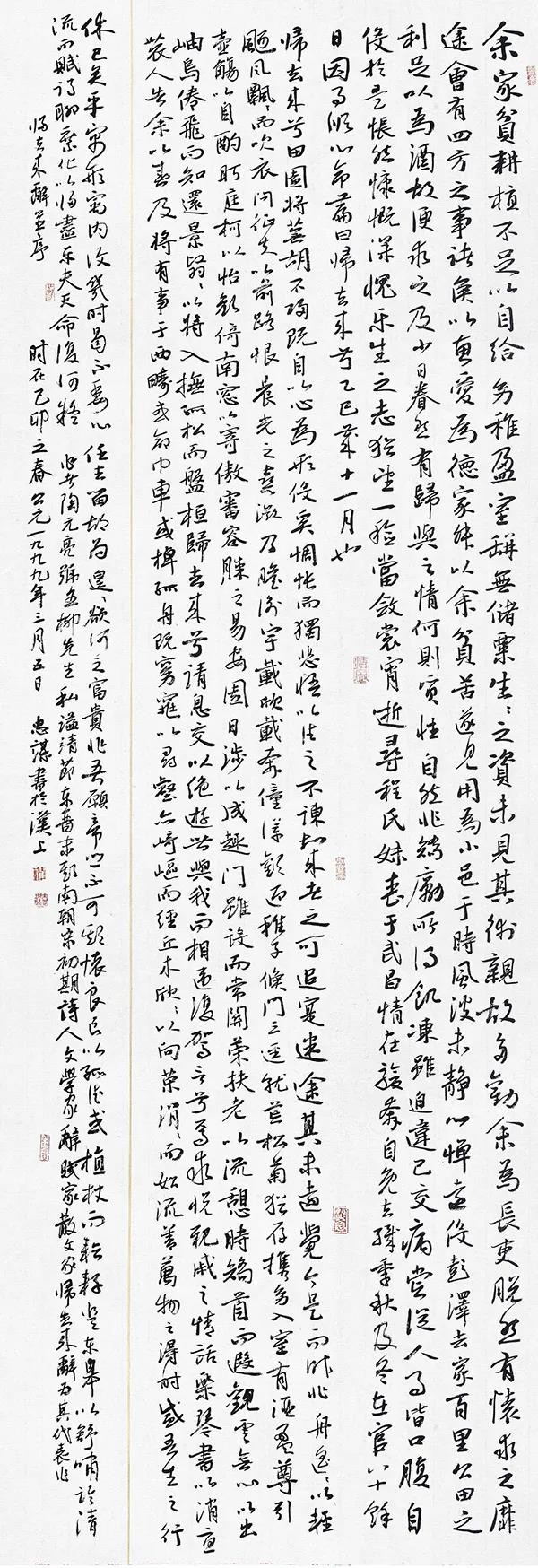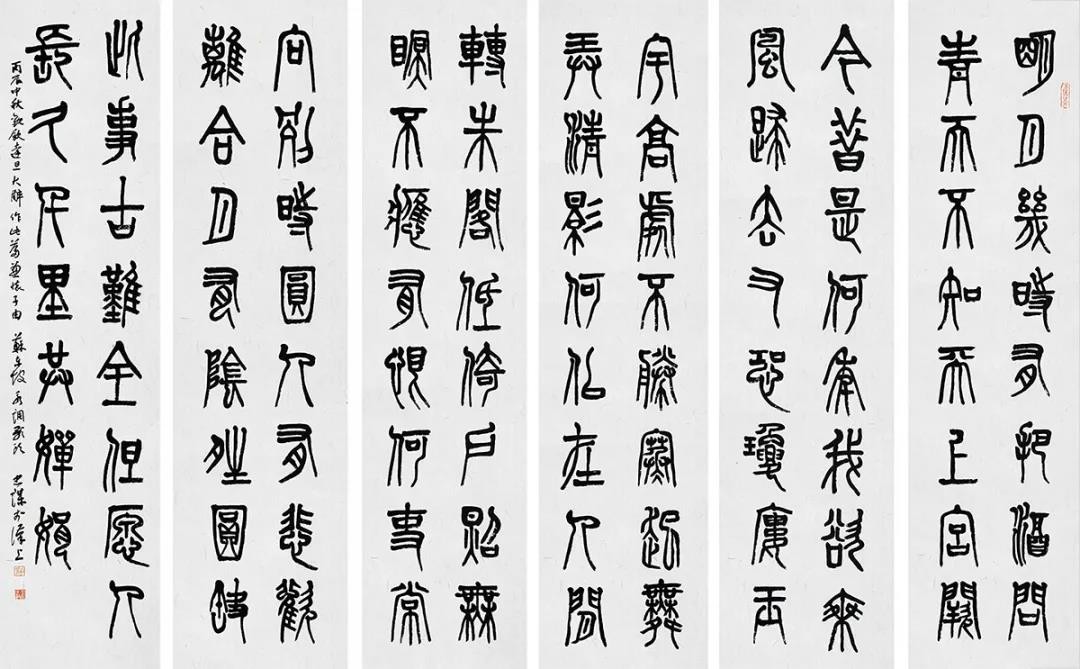 其靜之境在于雅室凈案,詩韻書香。常持凝神定氣,心不躁動(dòng),筆穩(wěn)力健,由此,卷軸伸延,繁花似錦。其書涉體寬廣,篆隸楷行草,或臨或作,皆以雄秀風(fēng)格為統(tǒng)領(lǐng)。如稼穡人蕃衍諸類,卻能以己之觀念方法為之,與原始之植或有不適,但一統(tǒng)法式,心裁別出。