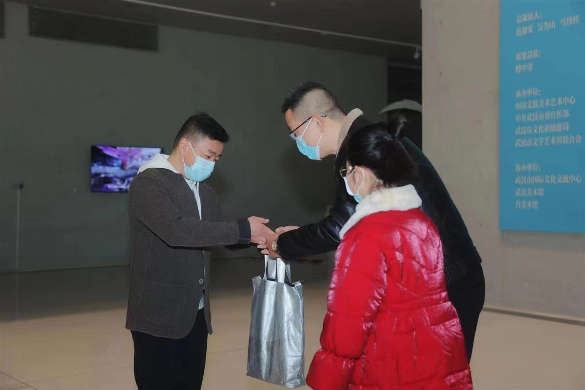 武漢美術(shù)館館長陳勇勁為第10萬名觀眾送上文創(chuàng)品禮包