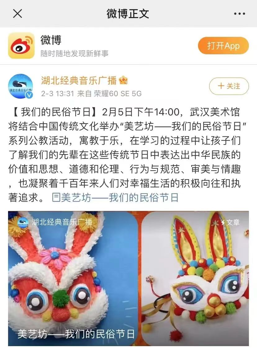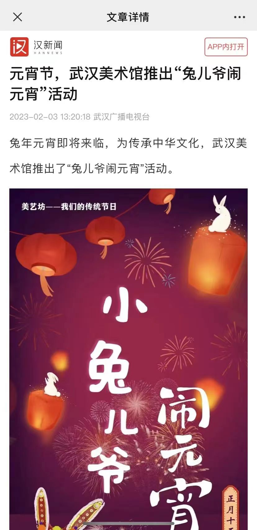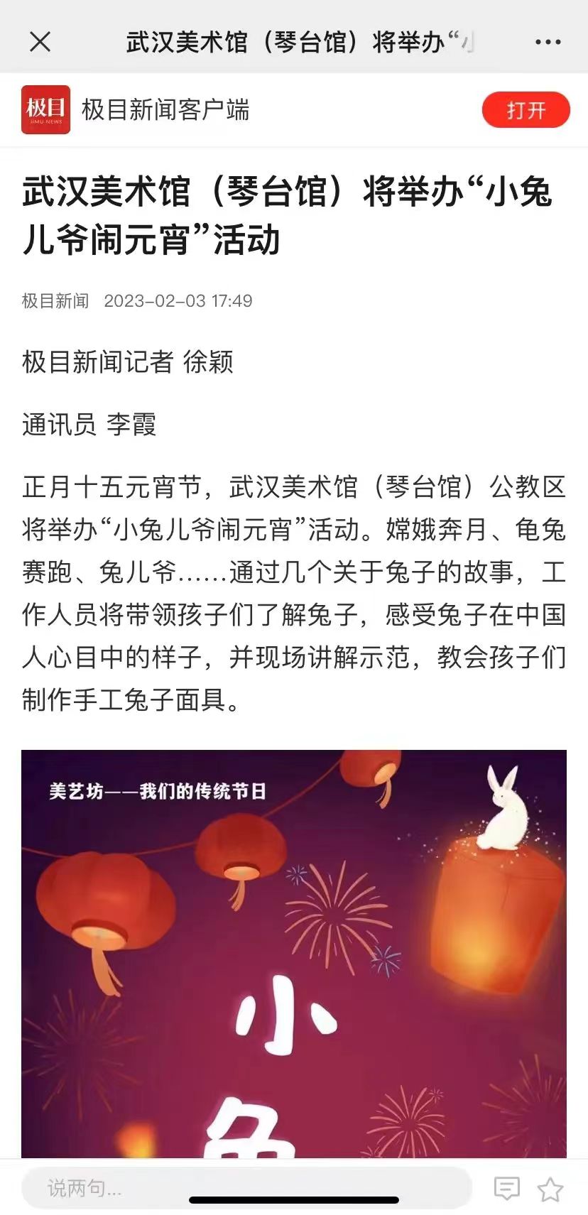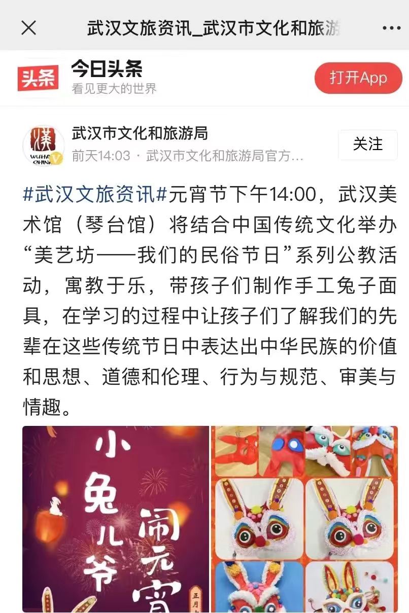 此次的“小兔兒爺鬧元宵”公教活動激發(fā)了孩子們的創(chuàng)造力、鍛煉了孩子們的動手能力,令傳統(tǒng)佳節(jié)煥發(fā)蓬勃朝氣,引發(fā)了觀眾和媒體的一致好評,今后,武漢美術(shù)館將持續(xù)發(fā)揮自身優(yōu)勢,為社會美育貢獻力量。