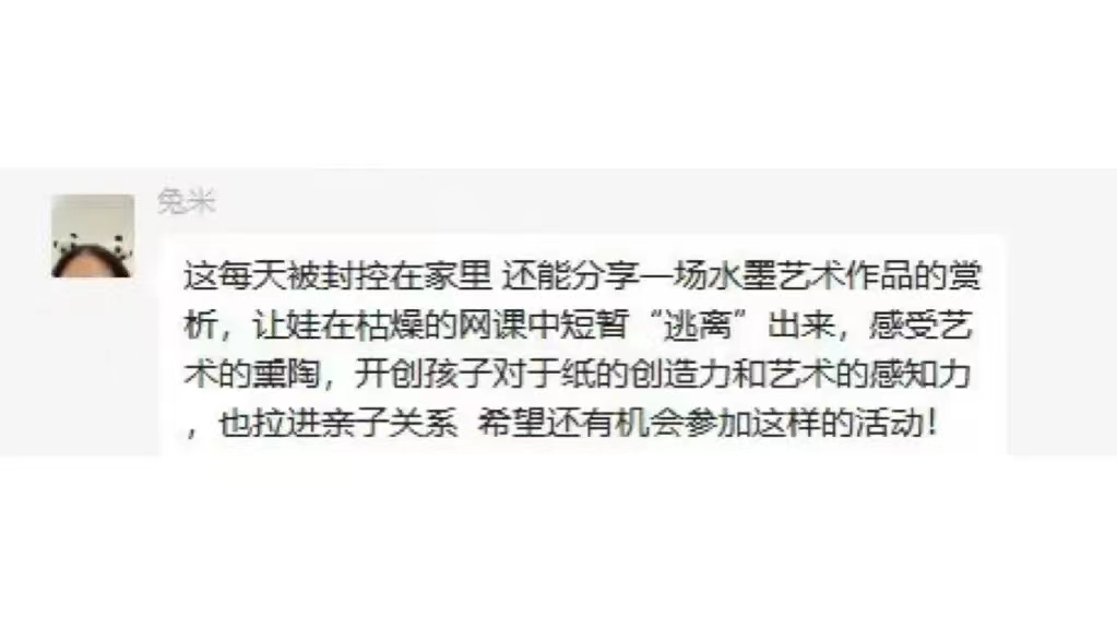 本次展覽系列主題線上公教活動(dòng)共開設(shè)了四場,活動(dòng)受到許多觀眾的喜愛,其中一位家長表示:“感謝武漢美術(shù)館讓小朋友悶在家還能感受到藝術(shù)的熏陶,這場公教活動(dòng)開創(chuàng)了孩子對于紙的創(chuàng)造力和藝術(shù)的感知力,也拉近了親子關(guān)系。期待還有機(jī)會(huì)能參加這樣的活動(dòng)!”