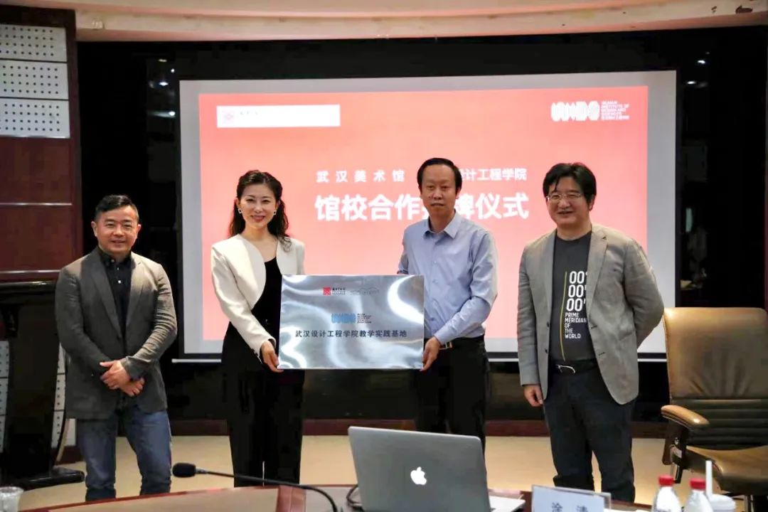 武漢美術(shù)館館長(zhǎng)陳勇勁、副館長(zhǎng)裴少菲,武漢設(shè)計(jì)工程學(xué)院董事長(zhǎng)程凡、副校長(zhǎng)徐擁華共同為實(shí)踐教育基地揭牌。
