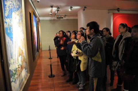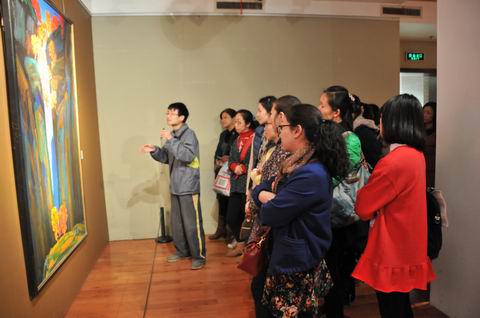 3月19日下午,江岸區(qū)教育局組織80余位小學美術(shù)教師觀展團到我館參觀《中華意蘊——中國當代油畫藝術(shù)展》,我館志愿者曹恒(湖北美術(shù)學院油畫專業(yè)碩士畢業(yè)生)擔任此次觀展團的講解。曹恒首先對整個畫展的概況進行了介紹,隨后就各個時期有代表性的畫作進行了詳細解讀,從題材、技法到風格進行了一一介紹,因為前來參觀的觀眾本身就是美術(shù)專業(yè)教師,在看展時還提出了許多較為專業(yè)的問題,與志愿者曹恒及我館員工進行深入交流,整個過程輕松愉悅,雙方都收獲良多。